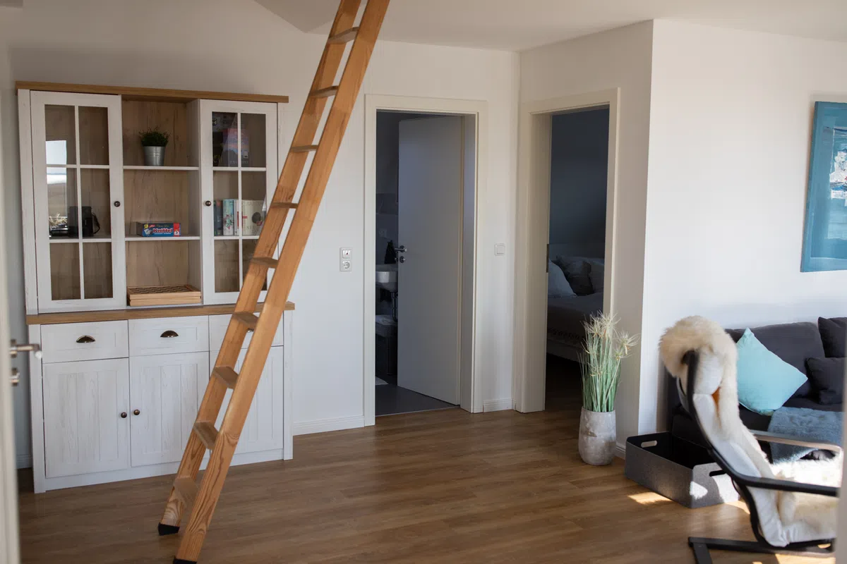 mit Küchenzeile, einem Schlafzimmer mit Doppelbett, einem Duschbad und einem Leseraum im Obergeschoss,